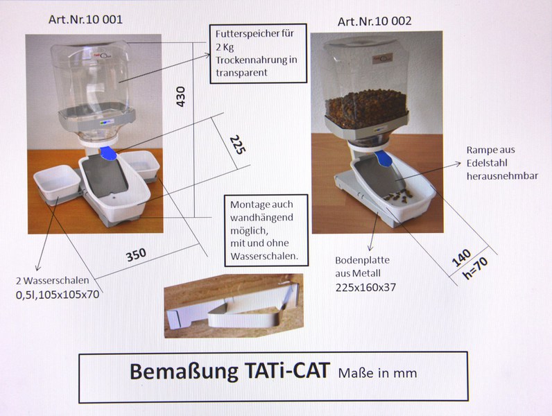 TATi-CATist der selbstbedienbare Futterspender der deiner Samtpfote/ ten über viele Jahre ermöglicht , kleinePortionen Trockenfutter ganz nach ihrem eigenen Rhytmus zu fressen-ganz ohne Strom.Timmer oder komplizierte Technik.