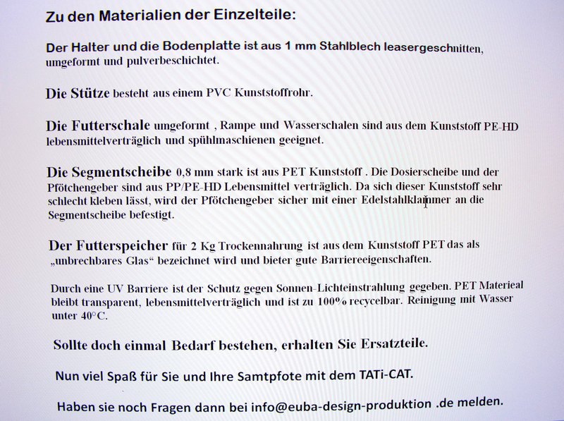 .-Patentierter "Pfötchengeber"deine Katze arbeitet spielerisch, stressfrei,ohne Hektik und mit geistiger Beschäftigung für ihre Mahlzeiten. Ein überfressen ist bei gesunden Katzen nicht bekannt.